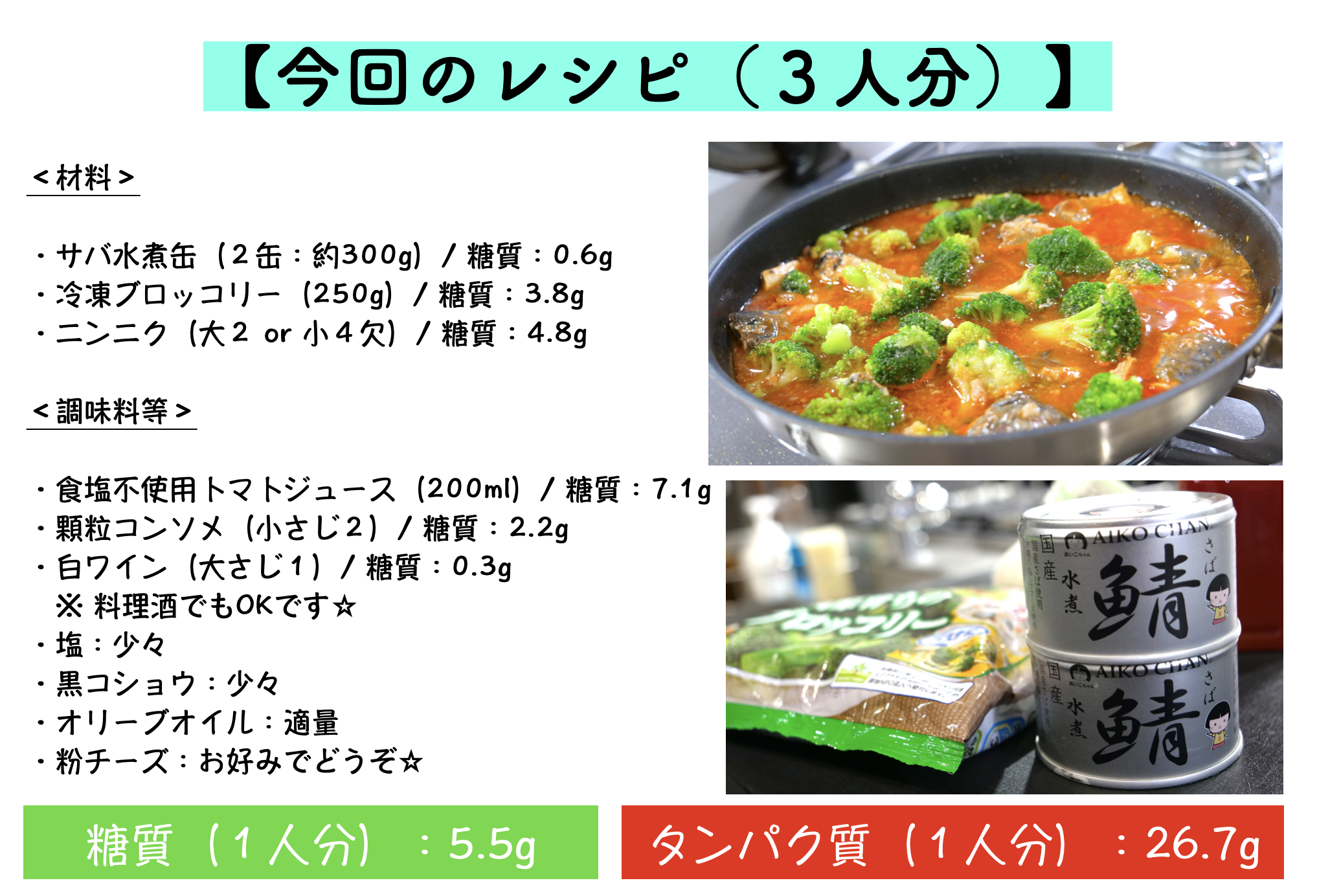 今回は、「サバ缶とブロッコリーのガーリックトマト煮込み」を紹介しました。